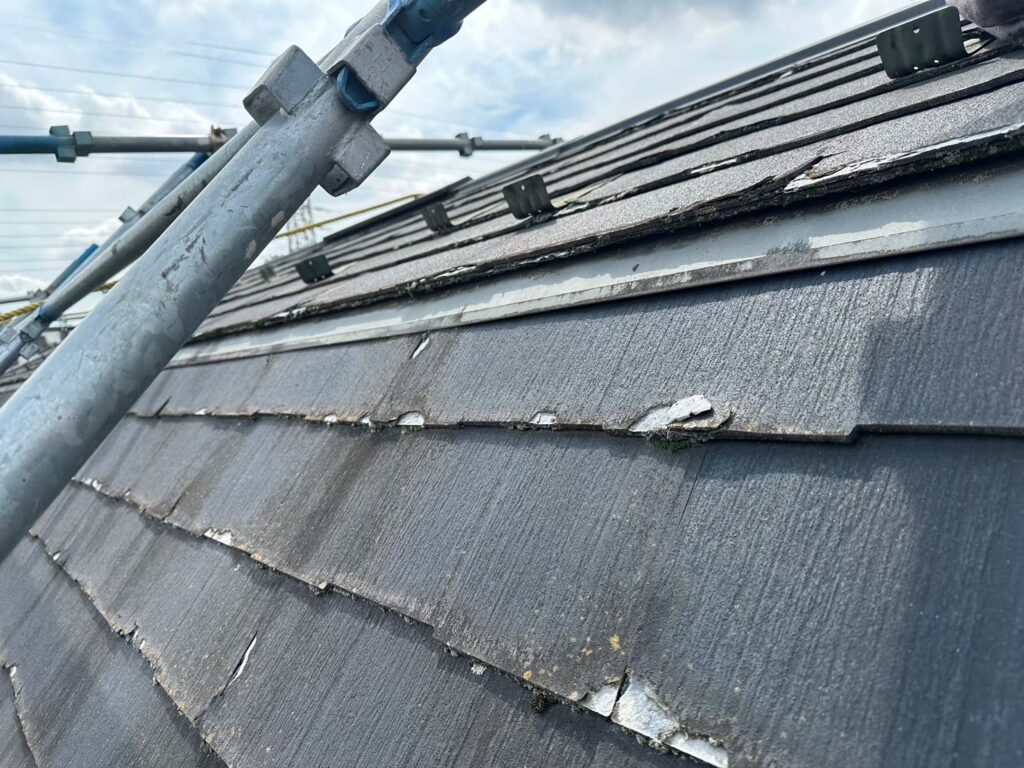 アスベスト無しのスレート屋根材は耐久性が悪く塗膜が剥がれると雨を吸い込み屋根材を脆くしていきます。