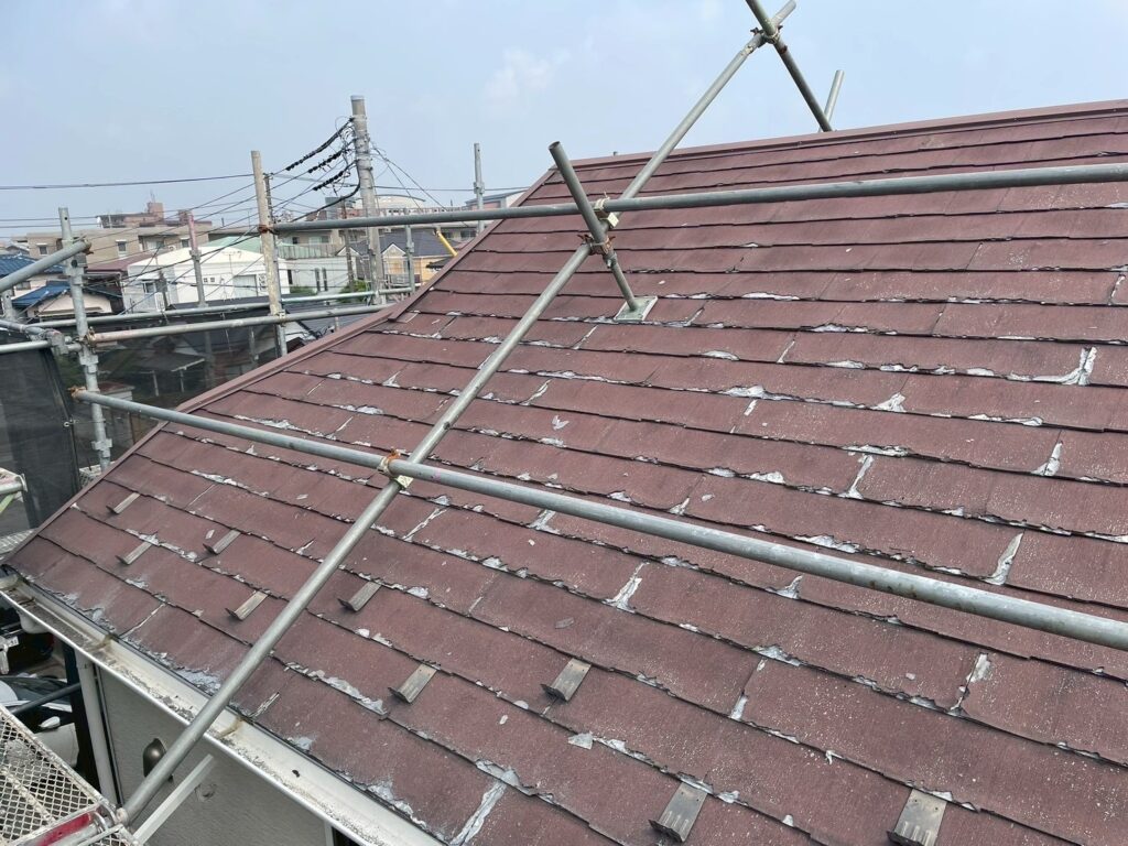 屋根材の表面が剥がれて落下し近所に広がってしまうので屋根全体のカバー工事をする事になりました。