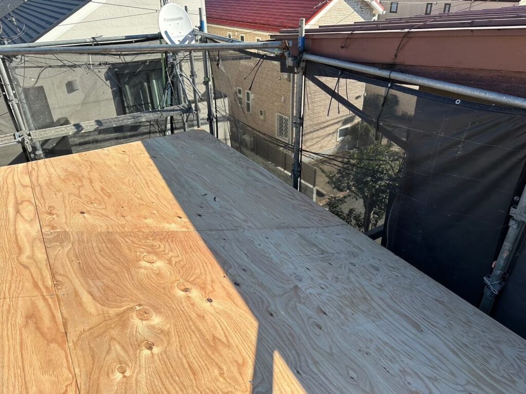 既存瓦屋根を全て撤去したら新しい屋根の下地を取り付けていきます。