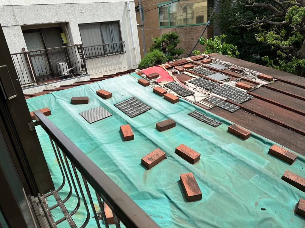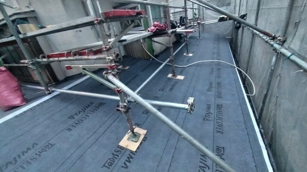 木下地を直したら施工中に雨漏りがしないように防水紙も取り付けていきます。