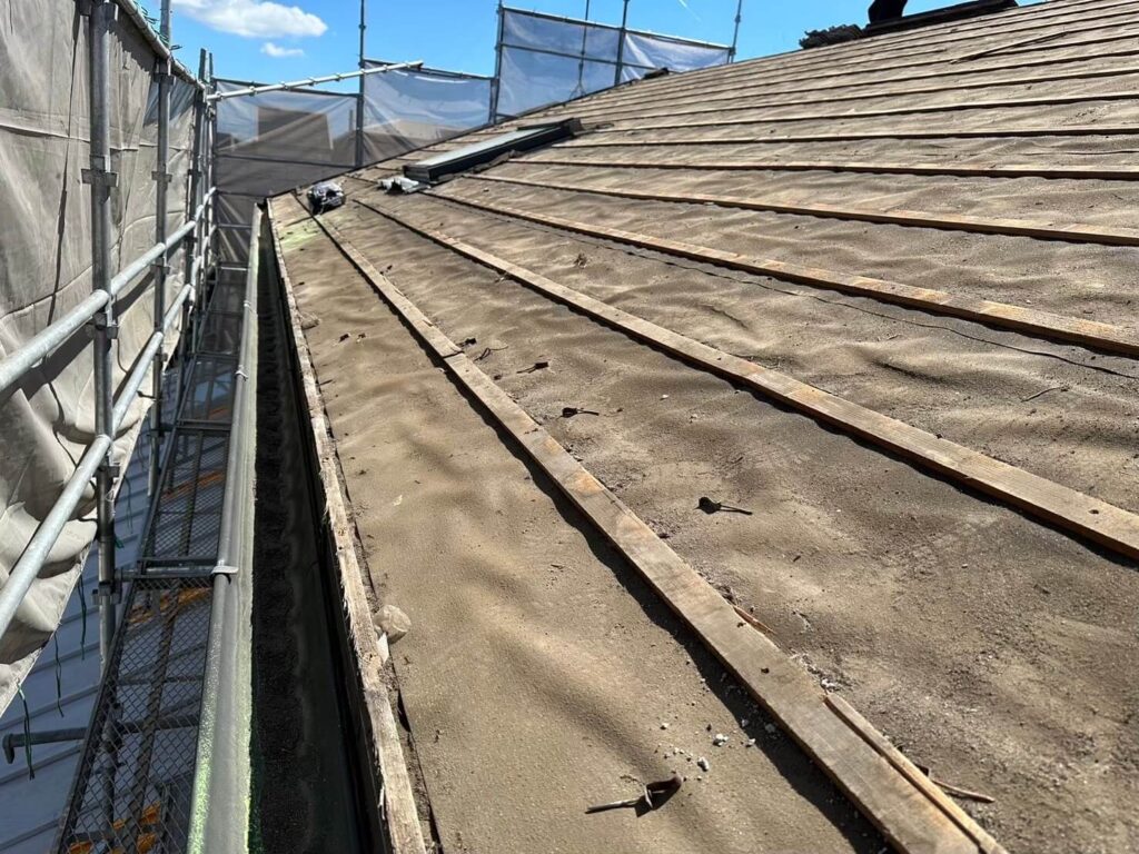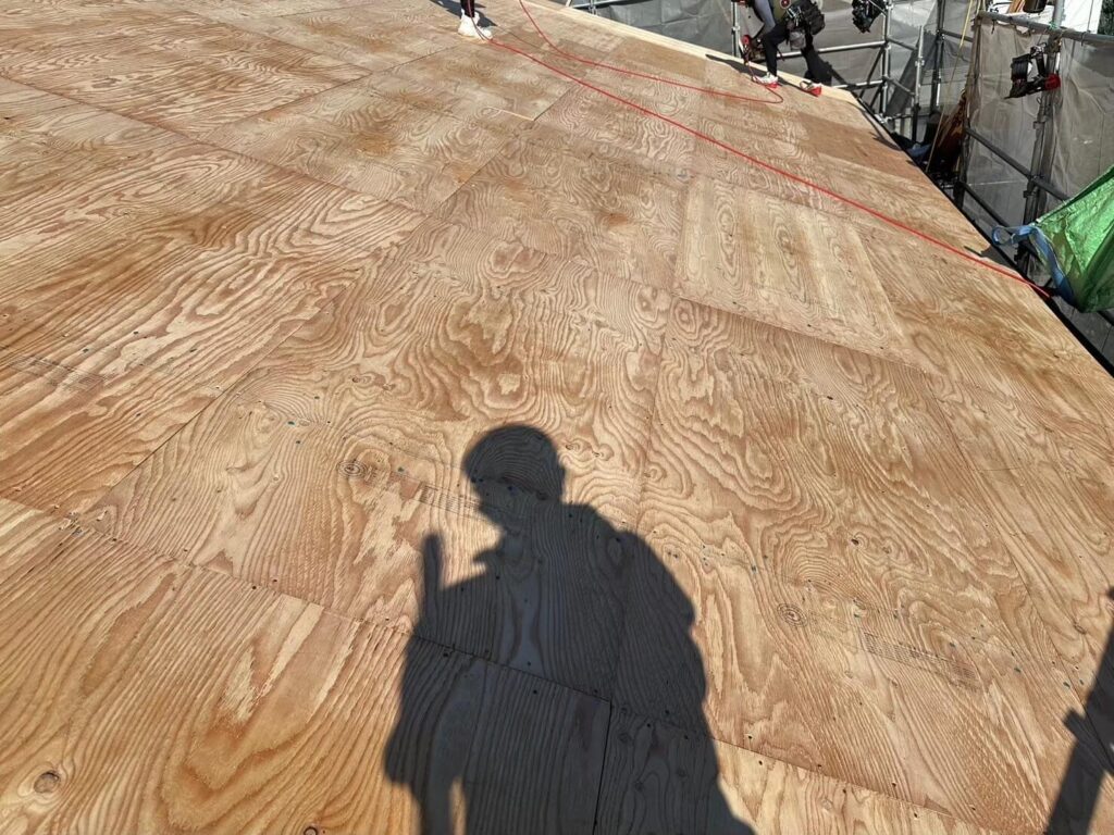 瓦を全て撤去したら屋根の下地補強の為に合板を取り付けます。
