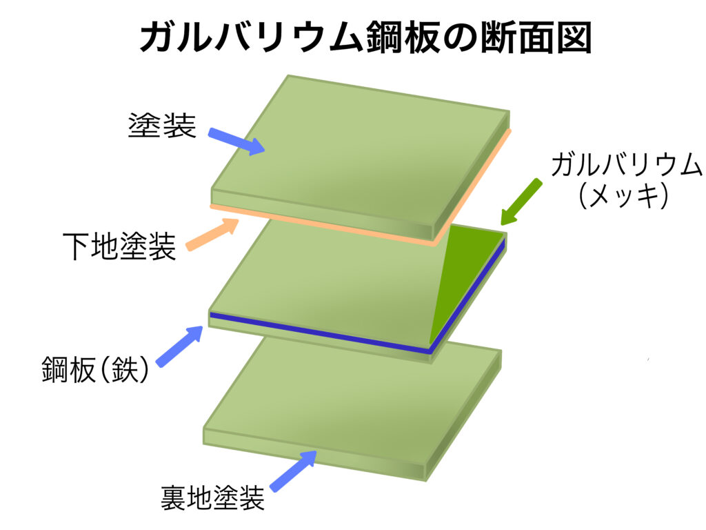 ガルバリウム鋼板は、アルミニウム・亜鉛・シリコンを主成分とする金属屋根材です。