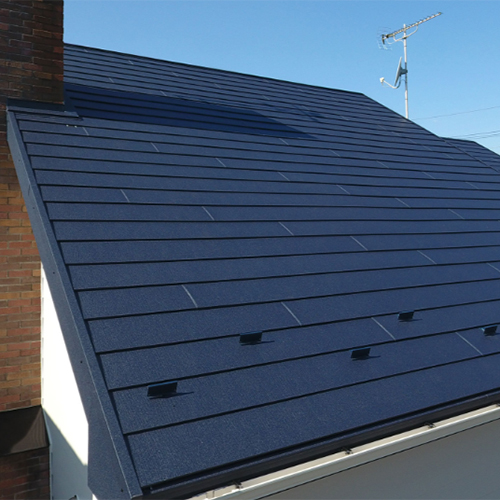 葺き上がりを一層引き立てる卓越した質感を誇る特殊な「ちぢみ塗装」を採用した、意匠性に富んだ屋根材です。