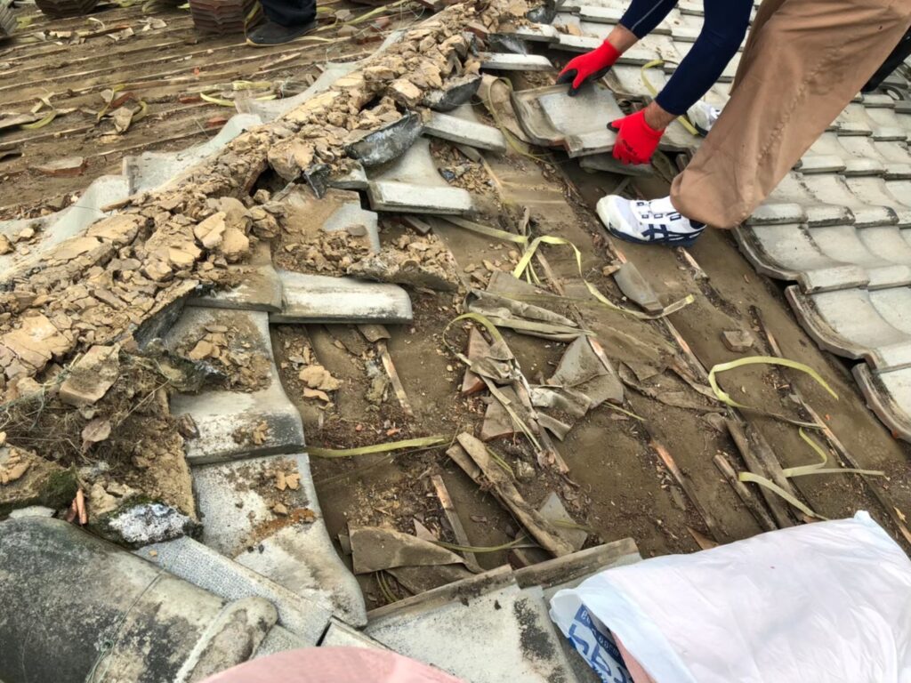 台風が過ぎたら、まず家の周りを見渡して屋根の破片や落ちた瓦がないか確認しましょう。屋根の点検は危険ですので専門業者に頼みましょう。